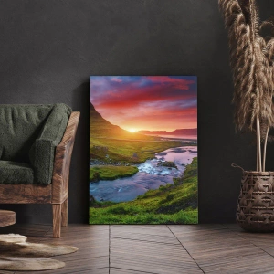 Cuadro sobre lienzo - Impresión de Imagen - Cascada pintoresca y montaña al atardecer - 70x50cm - Islandia - fuego y agua - Decoración de pared moderna para salón y dormitorio ARTTOR