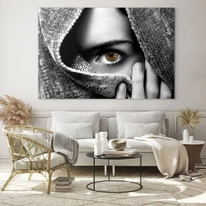 Cuadro sobre vidrio - Impresiones sobre Vidrio - Un ojo oculto tras una textura de tela monocromática. - 50x70cm - Conoce el misterio - Decoración de pared moderna para salón y dormitorio ARTTOR