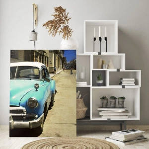Cuadro sobre vidrio - Impresiones sobre Vidrio - Coche azul antiguo en la calle bajo el sol - 70x50cm - ¡Viva Cuba! - Decoración de pared moderna para salón y dormitorio ARTTOR
