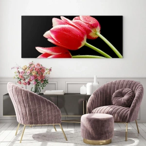Cuadro sobre vidrio - Impresiones sobre Vidrio - Tulipanes rojos con gotas de rocío sobre un fondo negro - 100x70cm - Promesa de amor puro - Decoración de pared moderna para salón y dormitorio ARTTOR