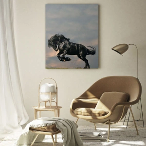 Cuadro sobre vidrio - Impresiones sobre Vidrio - Un caballo oscuro en un salto dinámico contra un cielo nublado. - 100x70cm - Hermoso y libre - Decoración de pared moderna para salón y dormitorio ARTTOR