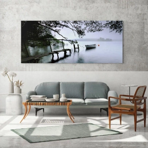 Cuadro sobre vidrio - Impresiones sobre Vidrio - Un embarcadero de madera sobre un lago brumoso con un barco al fondo. - 70x50cm - Ya estás descansando - Decoración de pared moderna para salón y dormitorio ARTTOR