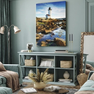 - Una pintura que presenta un hermoso faro contra una costa rocosa y un cielo azul. Perfecta para interiores que valoran la paz, la naturaleza y un ambiente costero.