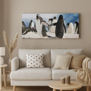 Cuadro sobre lienzo - Impresión de Imagen - Un grupo de pingüinos en la nieve en un paisaje antártico. - 160x50cm - Bailando en la nieve - Decoración de pared moderna para salón y dormitorio ARTTOR