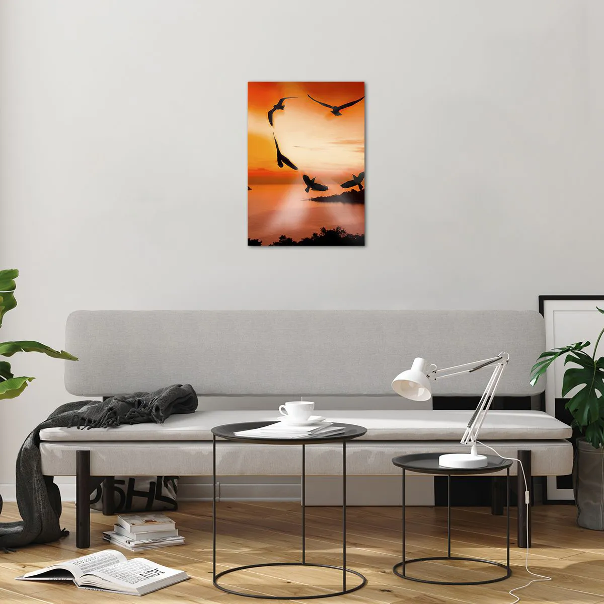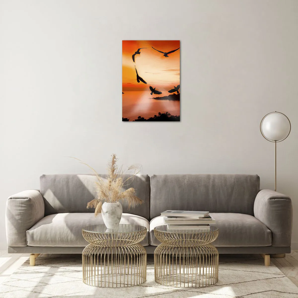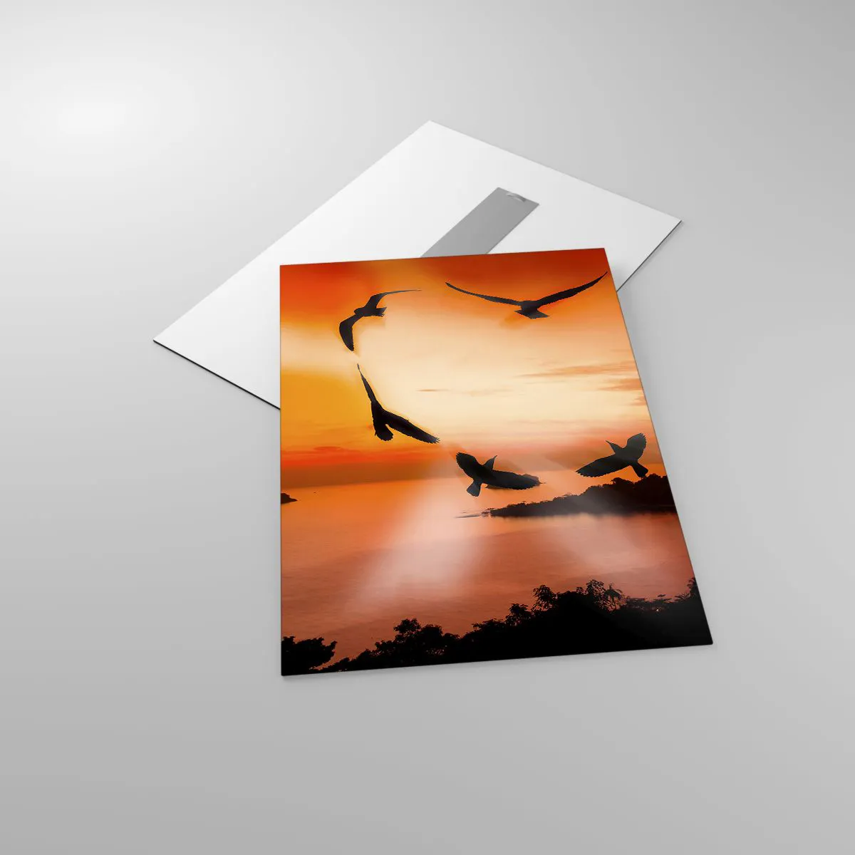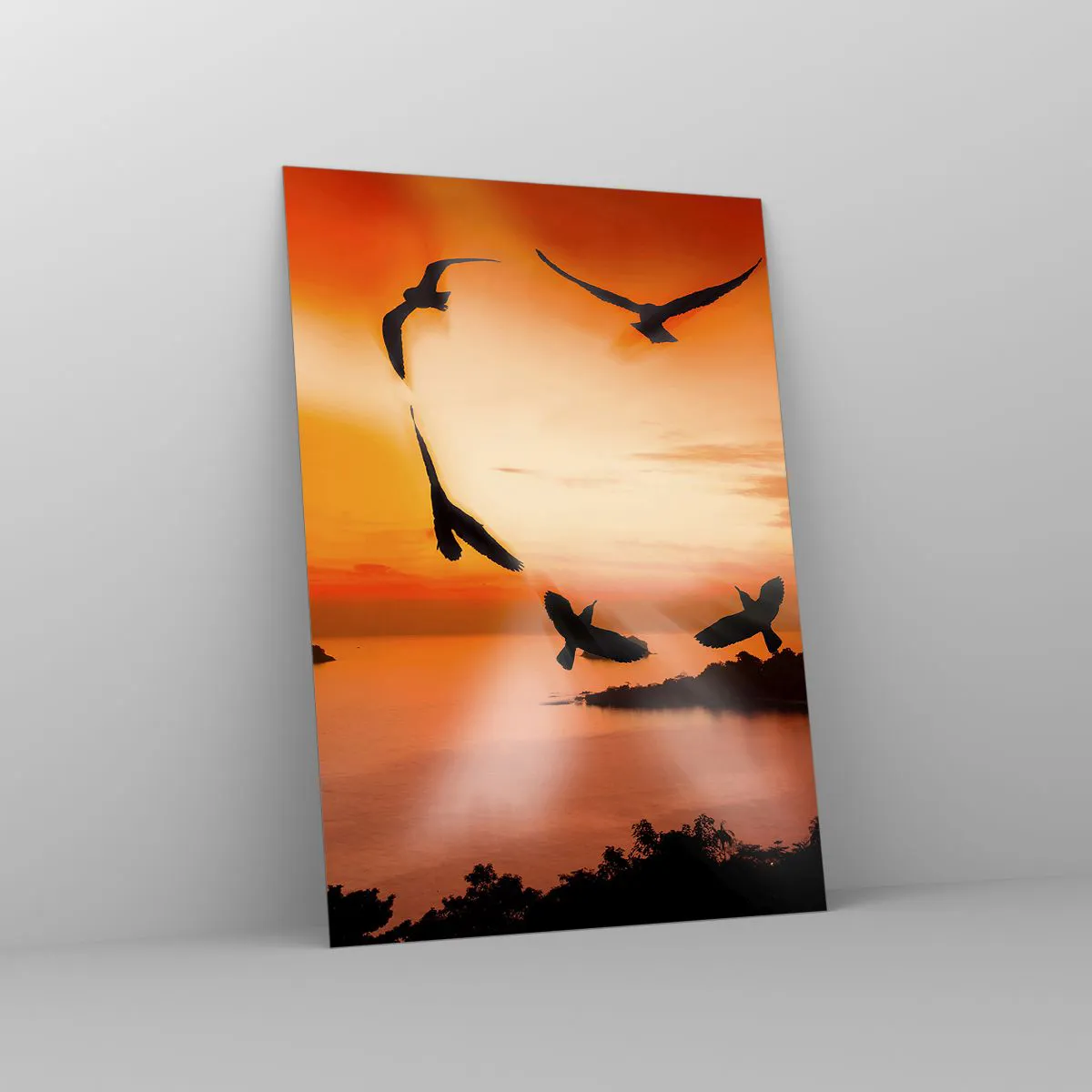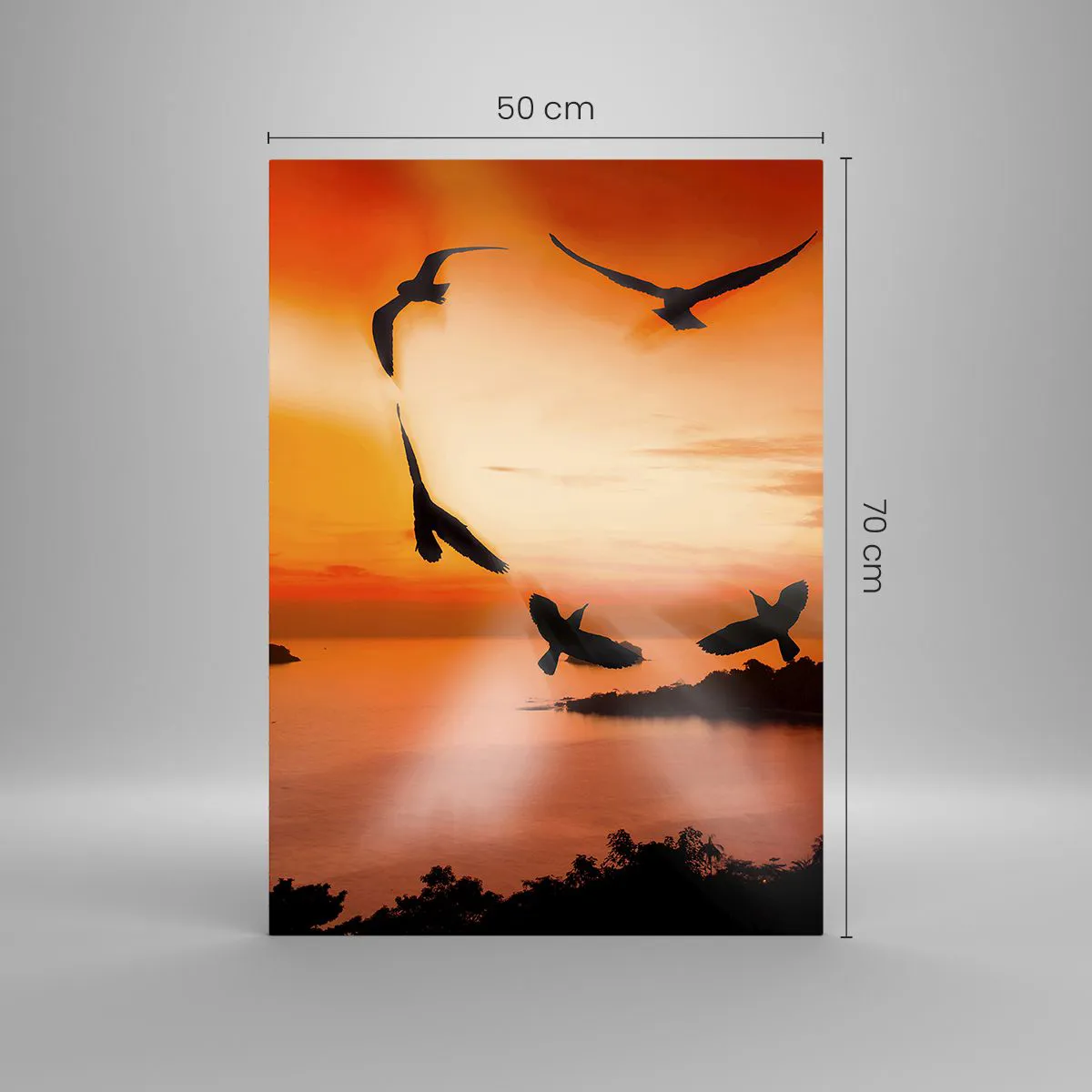 Cuadro sobre vidrio - Impresiones sobre Vidrio - Pájaros formando un corazón con el telón de fondo de una puesta de sol. - 50x70cm - Ama el mundo como los pájaros - Decoración de pared moderna para salón y dormitorio ARTTOR