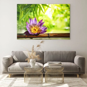 Cuadro sobre vidrio - Impresiones sobre Vidrio - Flor de loto morada sobre una tabla de bambú con fondo verde. - 120x80cm - Bajo el sol de Asia - Decoración de pared moderna para salón y dormitorio ARTTOR