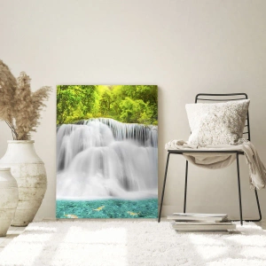 Cuadro sobre vidrio - Impresiones sobre Vidrio - Una cascada rodeada de vegetación con agua cristalina. - 100x70cm - Cascada espumosa, de verde a azul - Decoración de pared moderna para salón y dormitorio ARTTOR