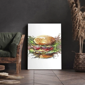 Cuadro sobre lienzo - Impresión de Imagen - Ilustración artística de una hamburguesa con elementos dinámicos. - 100x70cm - Tentación irresistible - Decoración de pared moderna para salón y dormitorio ARTTOR