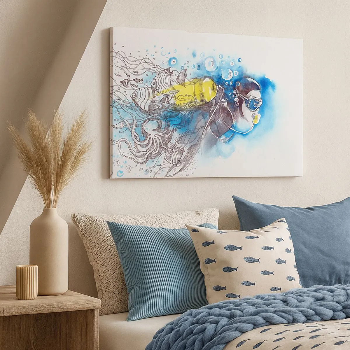 Cuadro sobre lienzo - Impresión de Imagen - Escena submarina con un buceador y peces exóticos. - 120x80cm - Sumergirse en lo desconocido - Decoración de pared moderna para salón y dormitorio ARTTOR