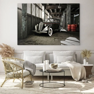 Cuadro sobre vidrio - Impresiones sobre Vidrio - Un elegante coche retro en un almacén rústico - 70x100cm - La elegancia perdurable de los años 30. - Decoración de pared moderna para salón y dormitorio ARTTOR