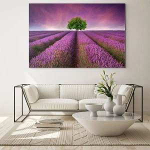 Cuadro sobre vidrio - Impresiones sobre Vidrio - Un campo de lavanda con un árbol solitario y un cielo púrpura. - 70x100cm - En los campos de lavanda - Decoración de pared moderna para salón y dormitorio ARTTOR