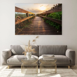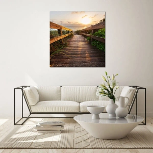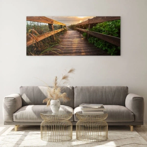 Cuadro sobre vidrio - Impresiones sobre Vidrio - Muelle de madera que conduce a la playa al atardecer - 140x50cm - Y directamente a la orilla - Decoración de pared moderna para salón y dormitorio ARTTOR