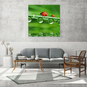 Cuadro sobre vidrio - Impresiones sobre Vidrio - Mariquitas sobre una brizna de hierba con gotas de rocío y reflejo en el agua. - 70x50cm - En el camino todo el verano - Decoración de pared moderna para salón y dormitorio ARTTOR