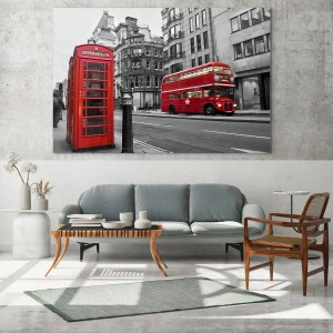 - La pintura representa una cabina telefónica roja y un autobús londinense sobre una calle en blanco y negro, creando un entorno elegante y contrastante.