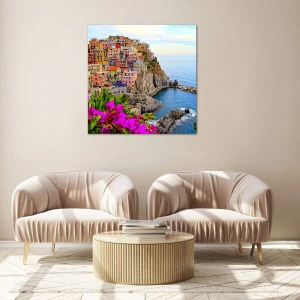 Cuadro sobre vidrio - Impresiones sobre Vidrio - Casas coloridas en un acantilado con vistas al mar en un paisaje pintoresco - 70x100cm - La ciudad de la risa - Decoración de pared moderna para salón y dormitorio ARTTOR