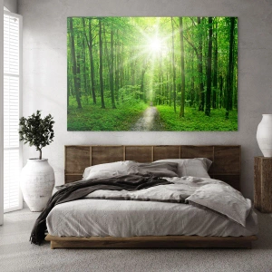 Cuadro sobre vidrio - Impresiones sobre Vidrio - Un camino en el bosque iluminado por los rayos del sol. - 50x70cm - Catedral verde - Decoración de pared moderna para salón y dormitorio ARTTOR