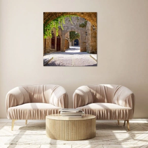 Cuadro sobre vidrio - Impresiones sobre Vidrio - Una calle de piedra con arcos y enredaderas a la luz del sol. - 70x50cm - La procesión está a punto de aparecer. - Decoración de pared moderna para salón y dormitorio ARTTOR