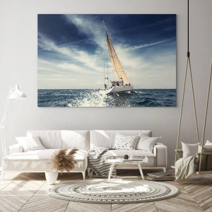 - Esta pintura representa un yate navegando en mares agitados bajo un cielo azul. Una decoración perfecta para los amantes de la navegación y las aventuras acuáticas.