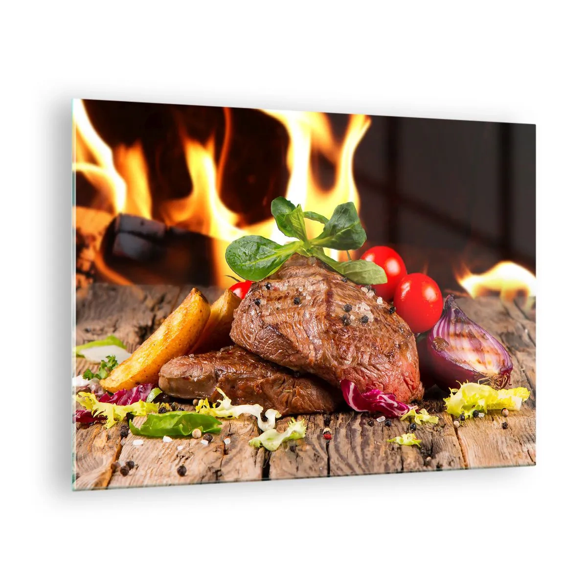 Hecho en vidrio de la más alta calidad, el cuadro reproduce a la perfección detalles como la textura del filete, los colores de las verduras y la intensidad de las llamas. La superficie del vidrio realza la profundidad de los colores, dándole al conjunto un aspecto distintivo y elegante.