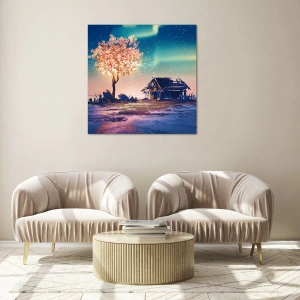 Cuadro sobre vidrio - Impresiones sobre Vidrio - Un paisaje mágico con un árbol en flor y una cabaña. - 50x70cm - La naturaleza perdura - Decoración de pared moderna para salón y dormitorio ARTTOR