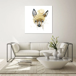 Cuadro sobre vidrio - Impresiones sobre Vidrio - Un corzo con un gorro de lana y pompón. - 50x70cm - Para el invierno en un bosque nevado - Decoración de pared moderna para salón y dormitorio ARTTOR