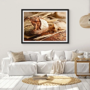 Póster en marco negro - Pan crujiente con cereales y espigas de trigo sobre un fondo de madera - 70x50cm - Apetitoso, fragante, crujiente - Decoración de pared moderna para salón y dormitorio ARTTOR
