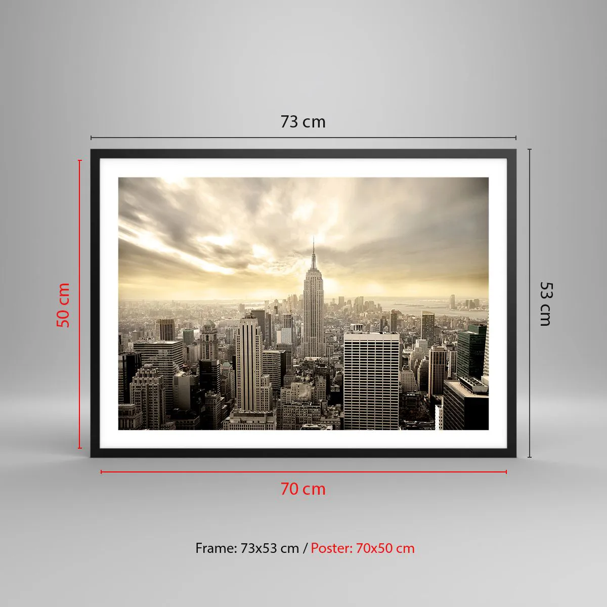 Póster en marco negro - Panorama de la ciudad con vista al Empire State Building - 70x50cm - Tejido neoyorquino en tonos grises - Decoración de pared moderna para salón y dormitorio ARTTOR