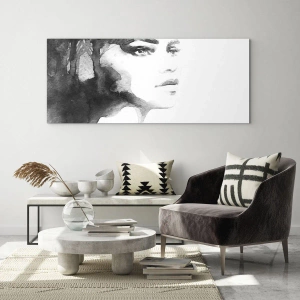 Cuadro sobre vidrio - Impresiones sobre Vidrio - Un retrato sutil de una mujer en tonos blanco y negro. - 140x50cm - Hecho de misterio y niebla - Decoración de pared moderna para salón y dormitorio ARTTOR