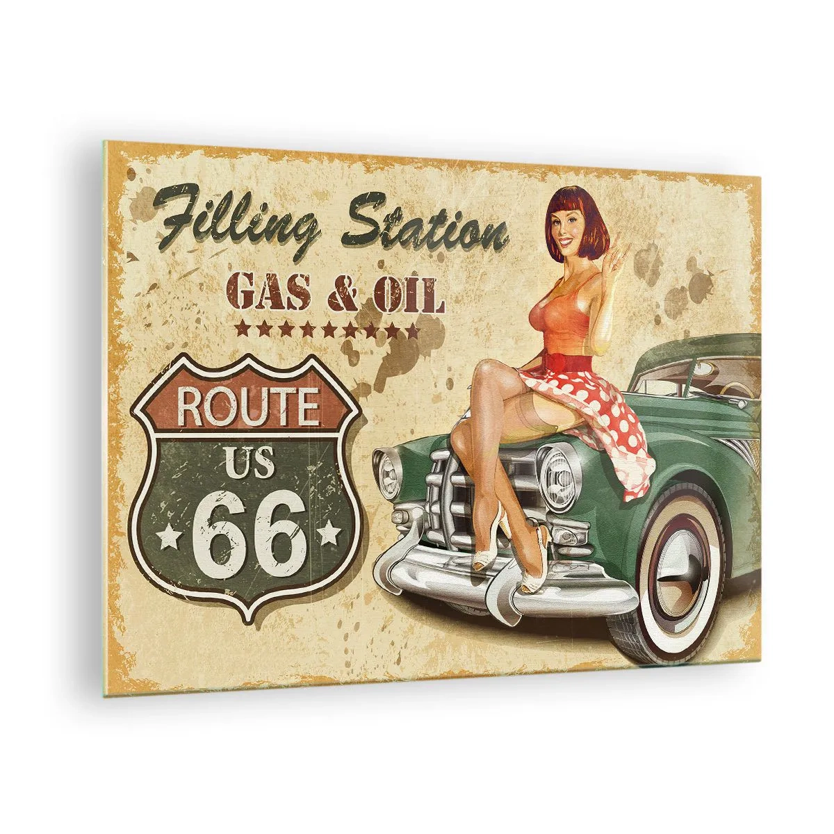 El cuadro de cristal de 70 x 50 cm, titulado Los magníficos años 40, es una decoración de pared única que nos transporta a la dorada década de 1940. La composición combina elementos de la Ruta 66, un coche clásico y un retrato retro de una mujer pin-up. El conjunto se mantiene en una atmósfera vintage, llena de nostalgia por los tiempos en que la libertad en la carretera era un símbolo del sueño americano.