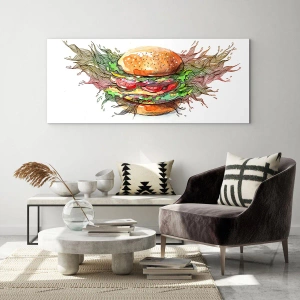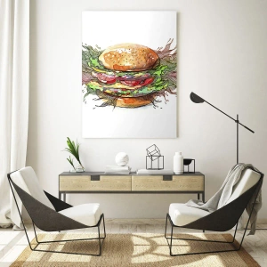 Cuadro sobre vidrio - Impresiones sobre Vidrio - Dibujo artístico de una hamburguesa con detalles en acuarela. - 50x70cm - Tentación irresistible - Decoración de pared moderna para salón y dormitorio ARTTOR