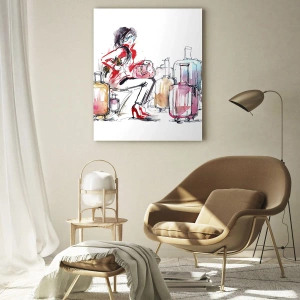 Cuadro sobre vidrio - Impresiones sobre Vidrio - Una mujer con un abrigo rojo rodeada de maletas en un estilo esquemático. - 70x50cm - Sentémonos antes del viaje - Decoración de pared moderna para salón y dormitorio ARTTOR