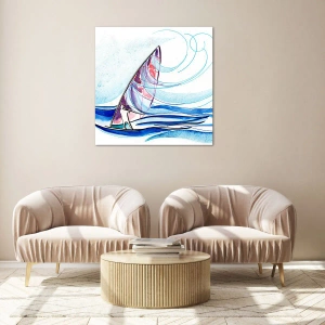Cuadro sobre vidrio - Impresiones sobre Vidrio - Un velero sobre las olas en estilo acuarela. - 50x70cm - Con el viento al ritmo de las olas - Decoración de pared moderna para salón y dormitorio ARTTOR