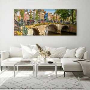 Cuadro sobre vidrio - Impresiones sobre Vidrio - Un puente sobre un canal rodeado de arquitectura histórica y vegetación. - 50x70cm - Primavera en el canal - Decoración de pared moderna para salón y dormitorio ARTTOR