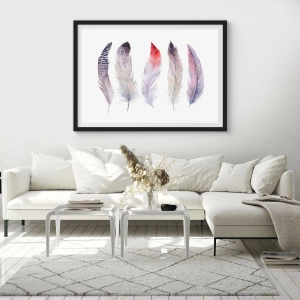 Póster en marco negro - Cinco delicadas plumas en tonos pastel sobre un fondo claro. - 100x70cm - Suave como la niebla de muchos colores - Decoración de pared moderna para salón y dormitorio ARTTOR