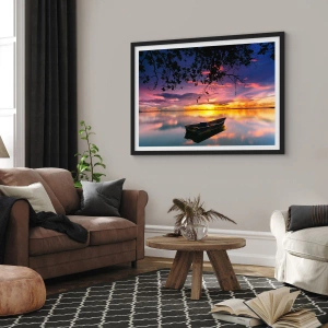 Póster en marco negro - Un barco en aguas tranquilas al atardecer. - 70x50cm - Un cielo de ensueño - Decoración de pared moderna para salón y dormitorio ARTTOR
