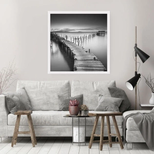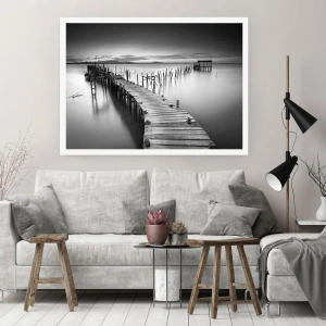 Póster - Un embarcadero de madera en un lago tranquilo en tonos grises. - 100x70cm - La calma de una orilla olvidada - Decoración de pared moderna para salón y dormitorio ARTTOR
