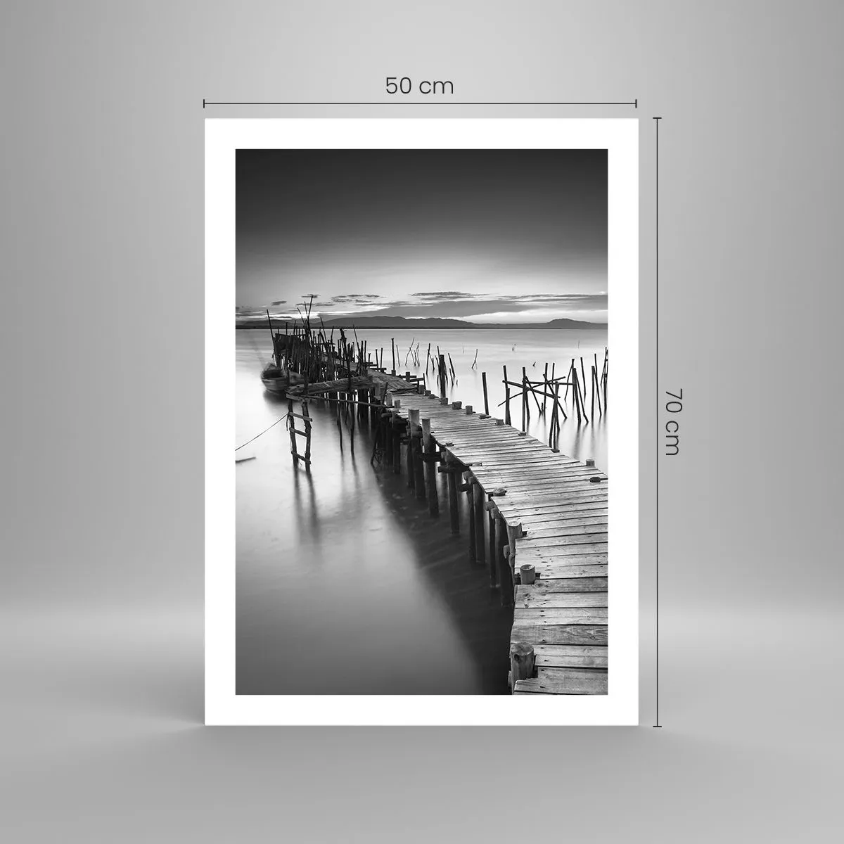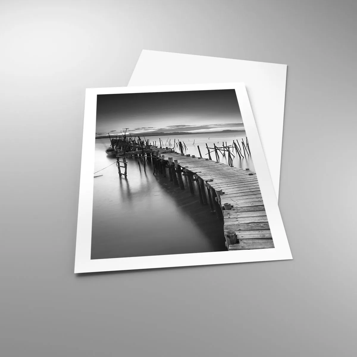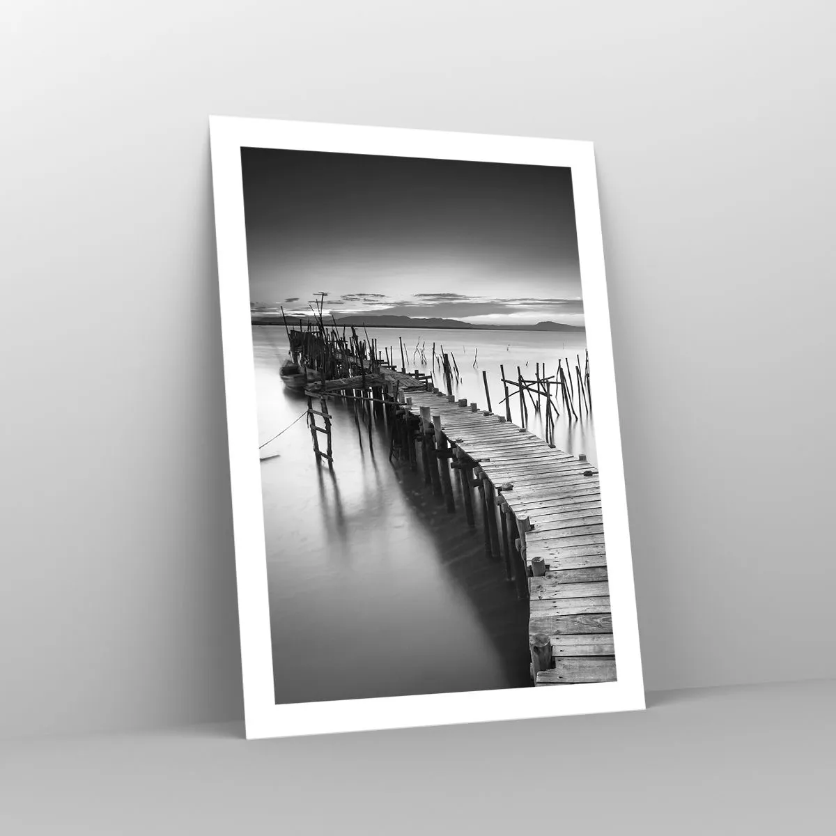 Póster - Un embarcadero de madera en blanco y negro sobre un lago tranquilo. - 50x70cm - La calma de una orilla olvidada - Decoración de pared moderna para salón y dormitorio ARTTOR