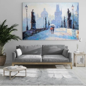 Cuadro sobre vidrio - Impresiones sobre Vidrio - Caminando con un paraguas por un puente histórico en un día lluvioso - 50x70cm - El embrujo de la lluvia - Decoración de pared moderna para salón y dormitorio ARTTOR