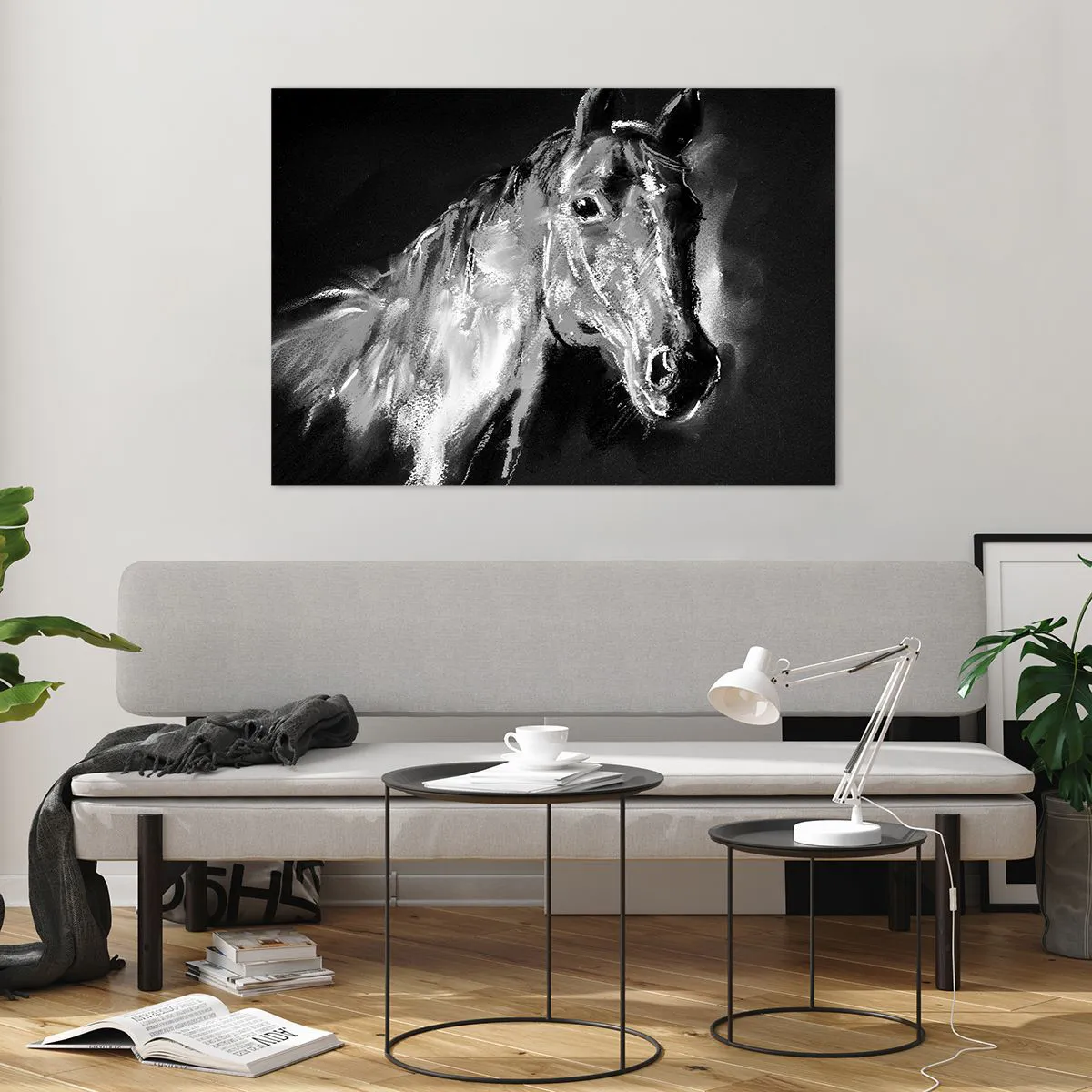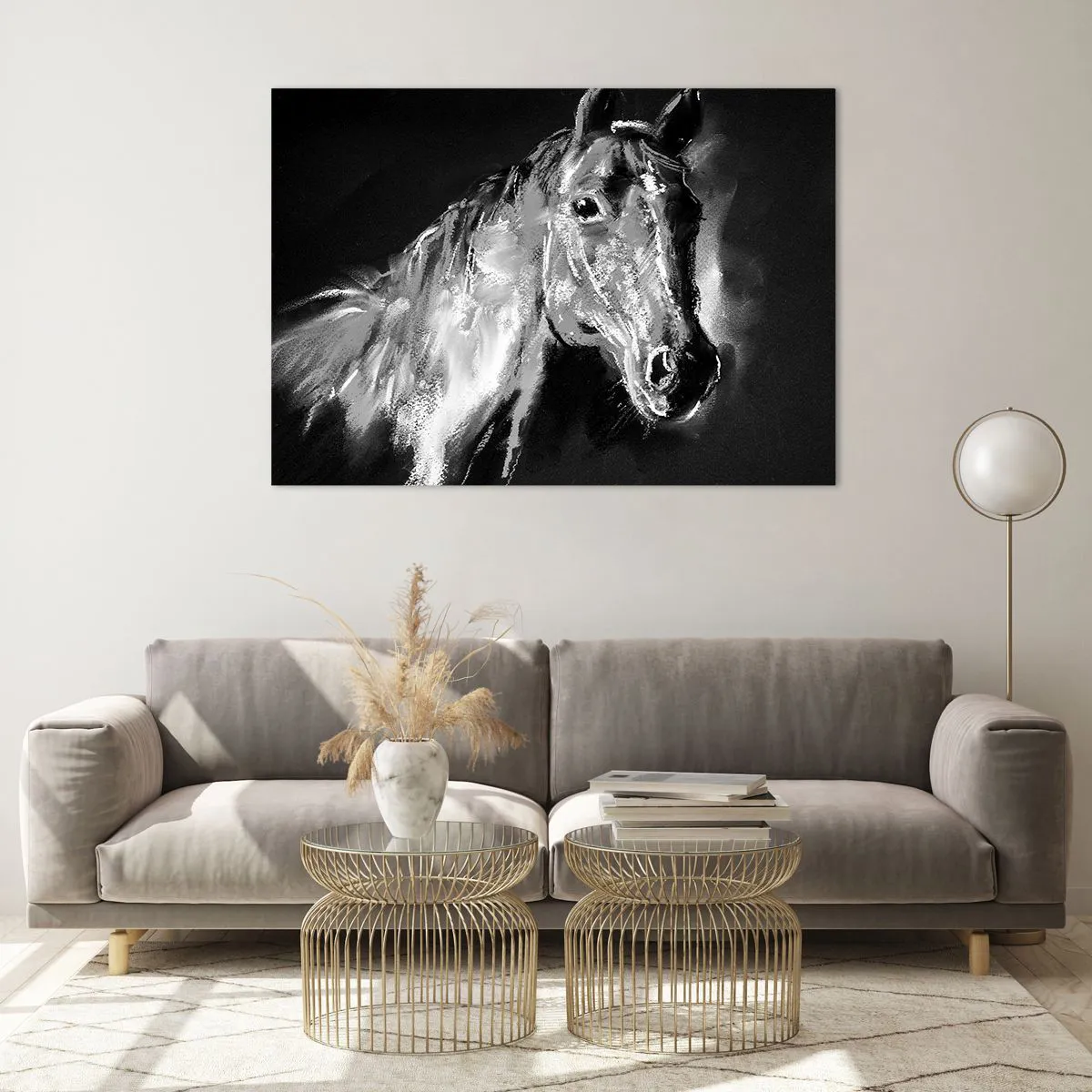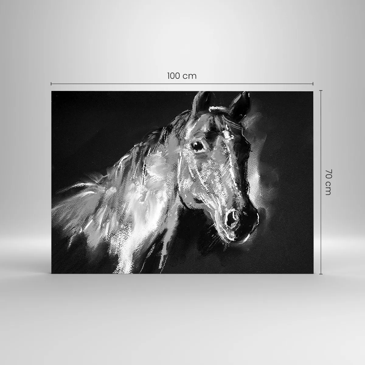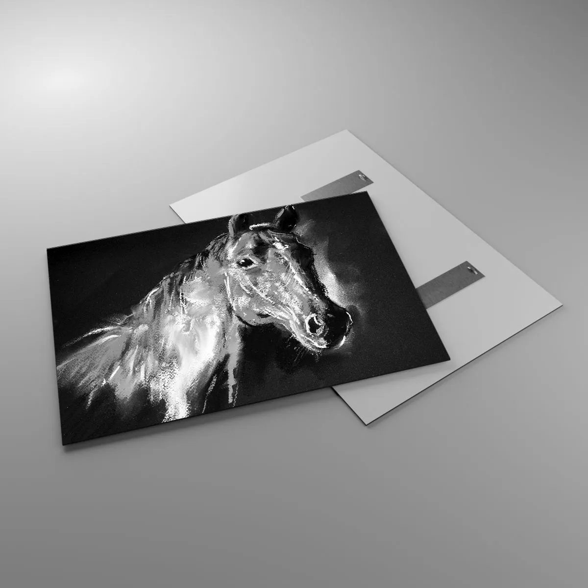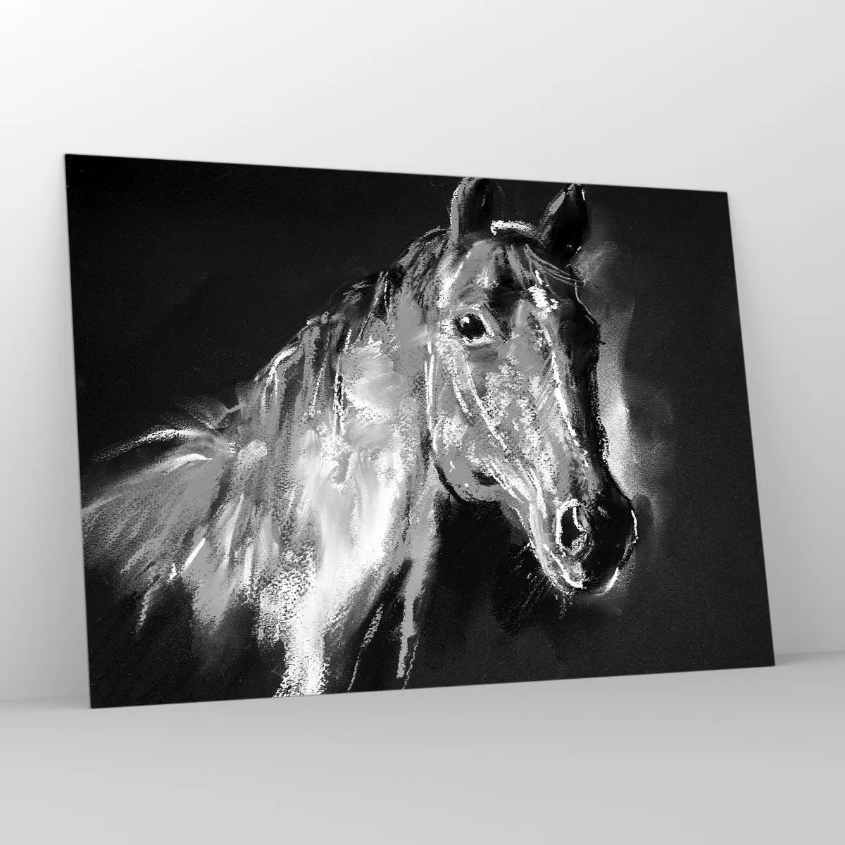 Cuadro sobre vidrio - Impresiones sobre Vidrio - Retrato de un caballo en tonos blanco y negro sobre un fondo oscuro. - 100x70cm - El brillo de un alma noble - Decoración de pared moderna para salón y dormitorio ARTTOR