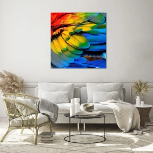 Cuadro sobre vidrio - Impresiones sobre Vidrio - Un primer plano de las coloridas plumas de un loro. - 160x50cm - Ave del paraíso - Decoración de pared moderna para salón y dormitorio ARTTOR