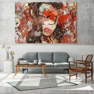 Cuadro sobre vidrio - Impresiones sobre Vidrio - Retrato abstracto de una mujer en tonos rojos y beige. - 120x80cm - Nadie sabe cómo eres realmente - Decoración de pared moderna para salón y dormitorio ARTTOR