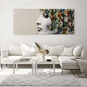 Cuadro sobre vidrio - Impresiones sobre Vidrio - Retrato de una mujer con acentos de color abstractos. - 50x70cm - Salió del gris - Decoración de pared moderna para salón y dormitorio ARTTOR