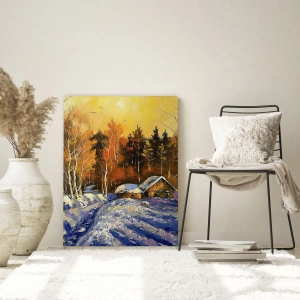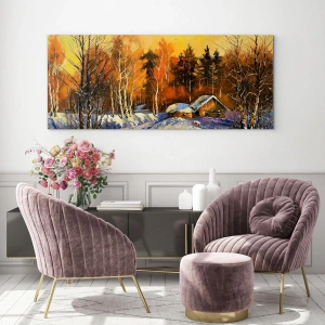 Cuadro sobre vidrio - Impresiones sobre Vidrio - Paisaje invernal con una cabaña de madera al atardecer - 120x80cm - Una impresión invernal al sol - Decoración de pared moderna para salón y dormitorio ARTTOR
