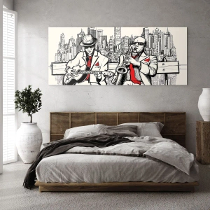 Cuadro sobre vidrio - Impresiones sobre Vidrio - Dos músicos de jazz tocando con el horizonte de la ciudad como telón de fondo. - 70x50cm - Improvisación en Nueva York - Decoración de pared moderna para salón y dormitorio ARTTOR