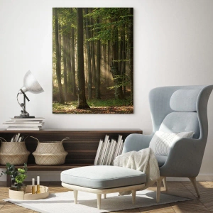 Cuadro de Arte Mural - Radiante en una Mañana de Primavera - Rayos de Sol Abriéndose Paso entre los Árboles del Bosque