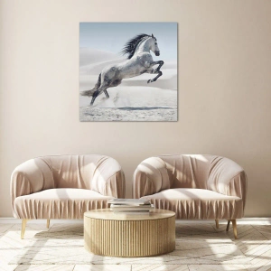 Cuadro sobre vidrio - Impresiones sobre Vidrio - Un caballo blanco saltando con el telón de fondo de las dunas del desierto. - 100x70cm - Un príncipe árabe - Decoración de pared moderna para salón y dormitorio ARTTOR