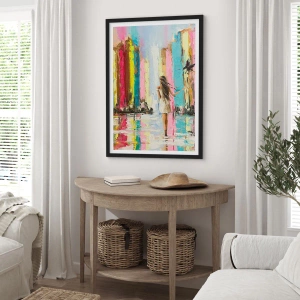 Póster en marco negro - Una ciudad colorida y una mujer con un vestido blanco con un pájaro. - 70x50cm - Sígueme - Decoración de pared moderna para salón y dormitorio ARTTOR