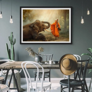 Póster en marco negro - Un monje con una túnica naranja con un elefante al fondo. - 50x70cm - Un encuentro en un viaje - Decoración de pared moderna para salón y dormitorio ARTTOR