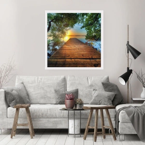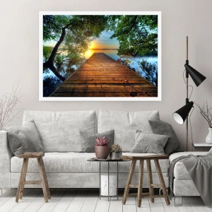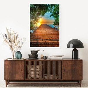 Póster - Un muelle de madera rodeado de vegetación durante la puesta de sol. - 100x70cm - Tómate tu tiempo, siéntate - Decoración de pared moderna para salón y dormitorio ARTTOR