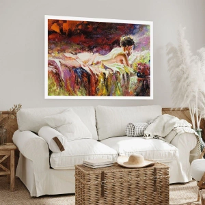 Póster - Una mujer acostada en una cama sobre un fondo de colores abstractos. - 100x70cm - Una Venus reflexiva - Decoración de pared moderna para salón y dormitorio ARTTOR
